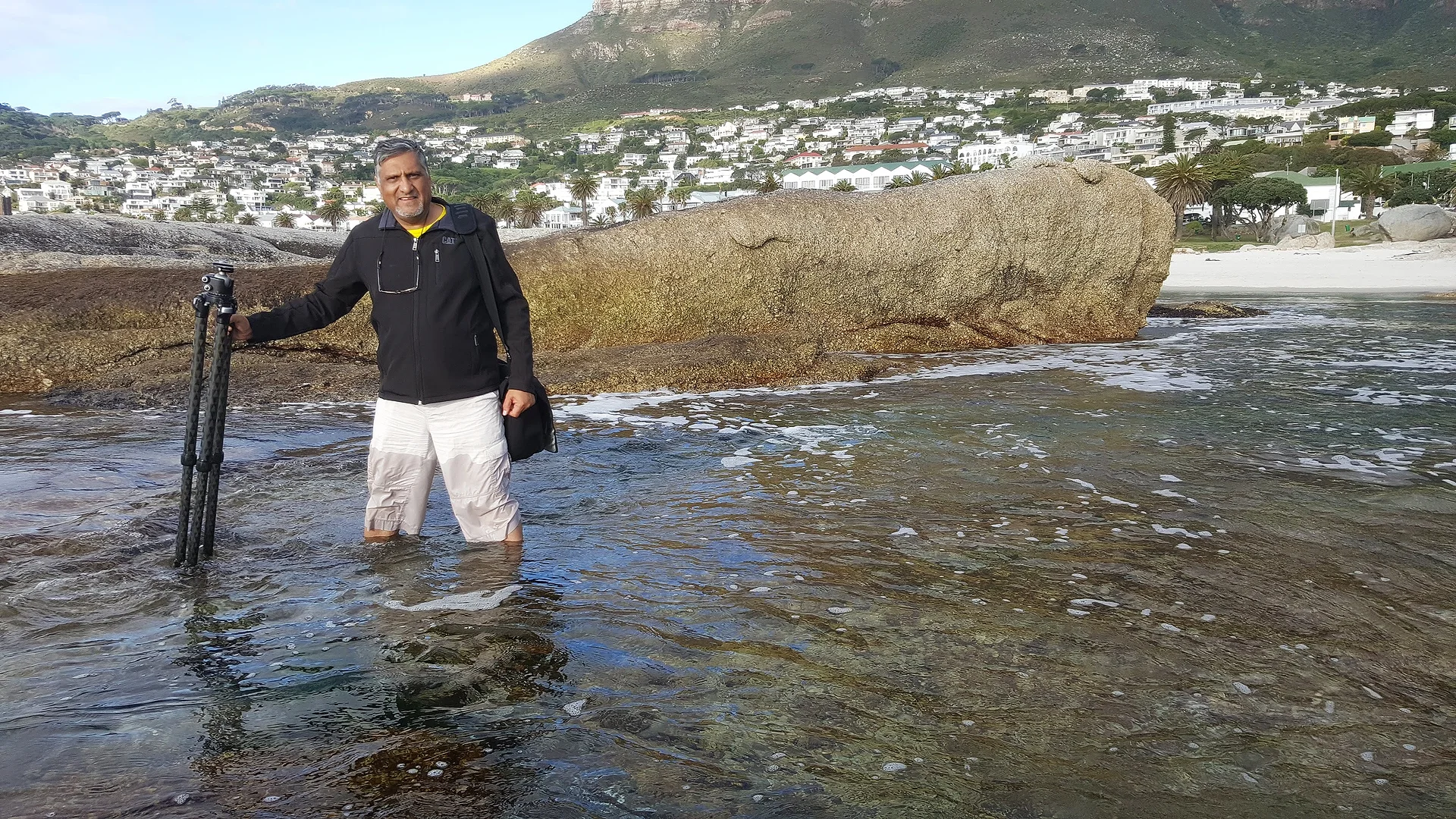 Braving the cold Atlantic Ocean waters at Camps Bay in Cape Town to reach a better vantage point for a shot.